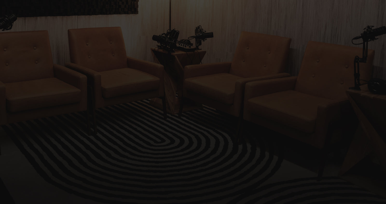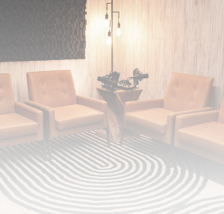 A dedicated soundproof studio for recording podcasts, narration, and voice-overs. The room involves a floating floor structure for acoustic isolation and is fully equipped with Audio-Technica dynamic microphones, monitoring headphones, and cameras for video streaming.